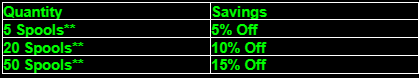 **A bulk order is classified as an order of 5 or more of the same color and material. Example: 5 spools of True Blue PLA. Orders of 10+ spools can be a combination of multiple colors and materials as long as they are in multiples of 5. Example: 5 spools of Red PLA and 5 spools of Black PETG